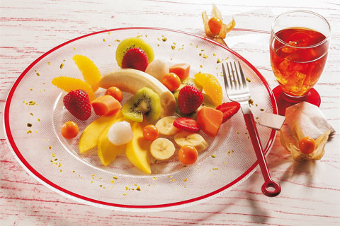 Die Früchte schälen. Banane und Kiwi in Scheiben, Mango in Spalten und die Papaya in mundgerechte Stücke schneiden. Orange filetieren. Litchis schälen und den Kern entfernen. Das Obst auf einem Teller anrichten und mit gehackten Pistazien bestreuen. Unterstützend Fastentee trinken.