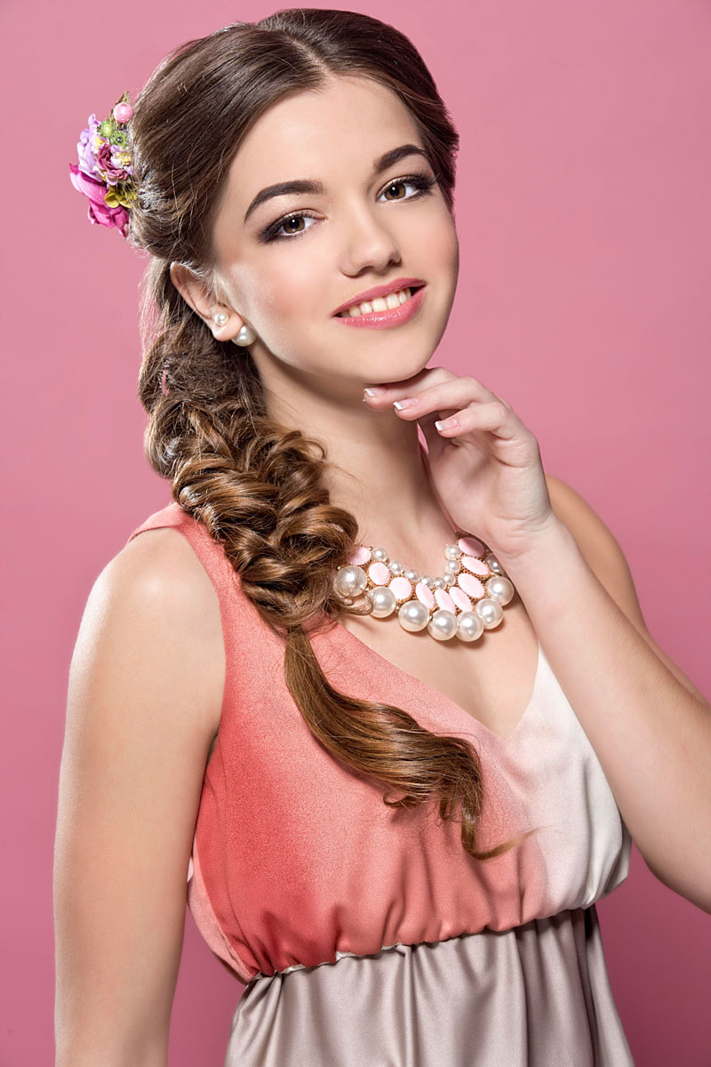 Die vorderen Strähnen sind etwas toupiert und legen sich füllig um den Kopf. Mit der großen Blumenspange entsteht der romantische Look. Durch den Mittelscheitel können eher breite Gesichter mit niedriger Stirn die Flechtfrisur gut tragen.