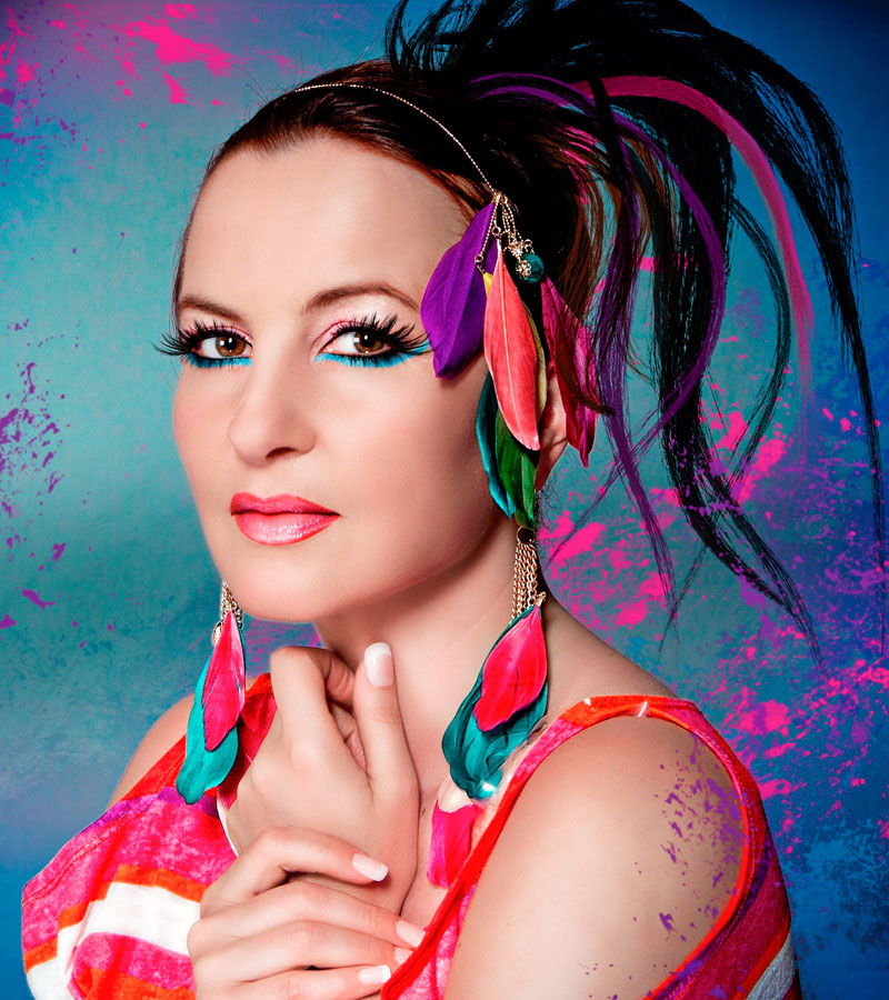 Unser Model trägt die mittellangen schwarzen Haare in einem hochgesteckten Zopf, der fransig vom Kopf absteht. In dem Schwarz kommen die pinken und lilafarbenen Strähnen perfekt zur Geltung. Mit einem Haarreifen und Ohrringen mit bunten Federn wird der ausdruckstarke Look aufgenommen. Den Zopf setzen Sie oben am Hinterkopf an und mit Haarklammern stecken Sie die Strähnen so fest, dass sie abstehen.