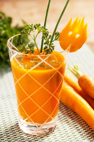 Den Brennnessel-Presssaft mit dem Möhrensaft auffüllen. Mit gehackter Petersilie bestreuen und mit einem ganzen Stängel Petersilie garnieren.