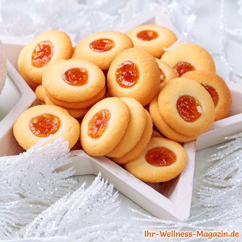 Mit der Verwendung von drei unterschiedlichen Low-Carb-Marmeladen oder -Konfitüren erhalten Sie mit nur einer Masse und nur einem Arbeitsaufwand eine bunte Auswahl an schmackhaften Weihnachtskeksen.
