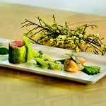 6 Jakobsmuscheln in Limonenöl kurz anbraten. Vor dem Anrichten die Muscheln mit Meersalz würzen und mit wenig Limonensaft beträufeln.
